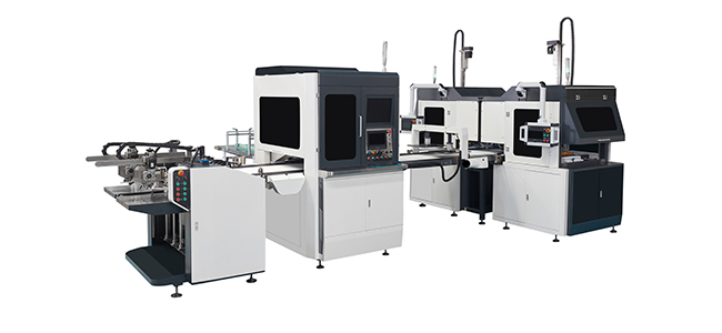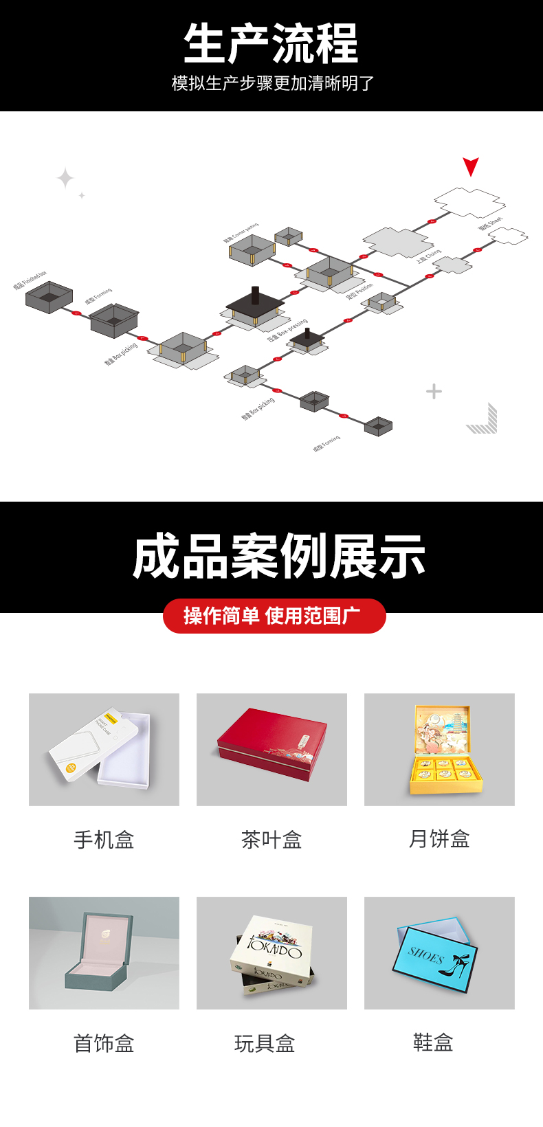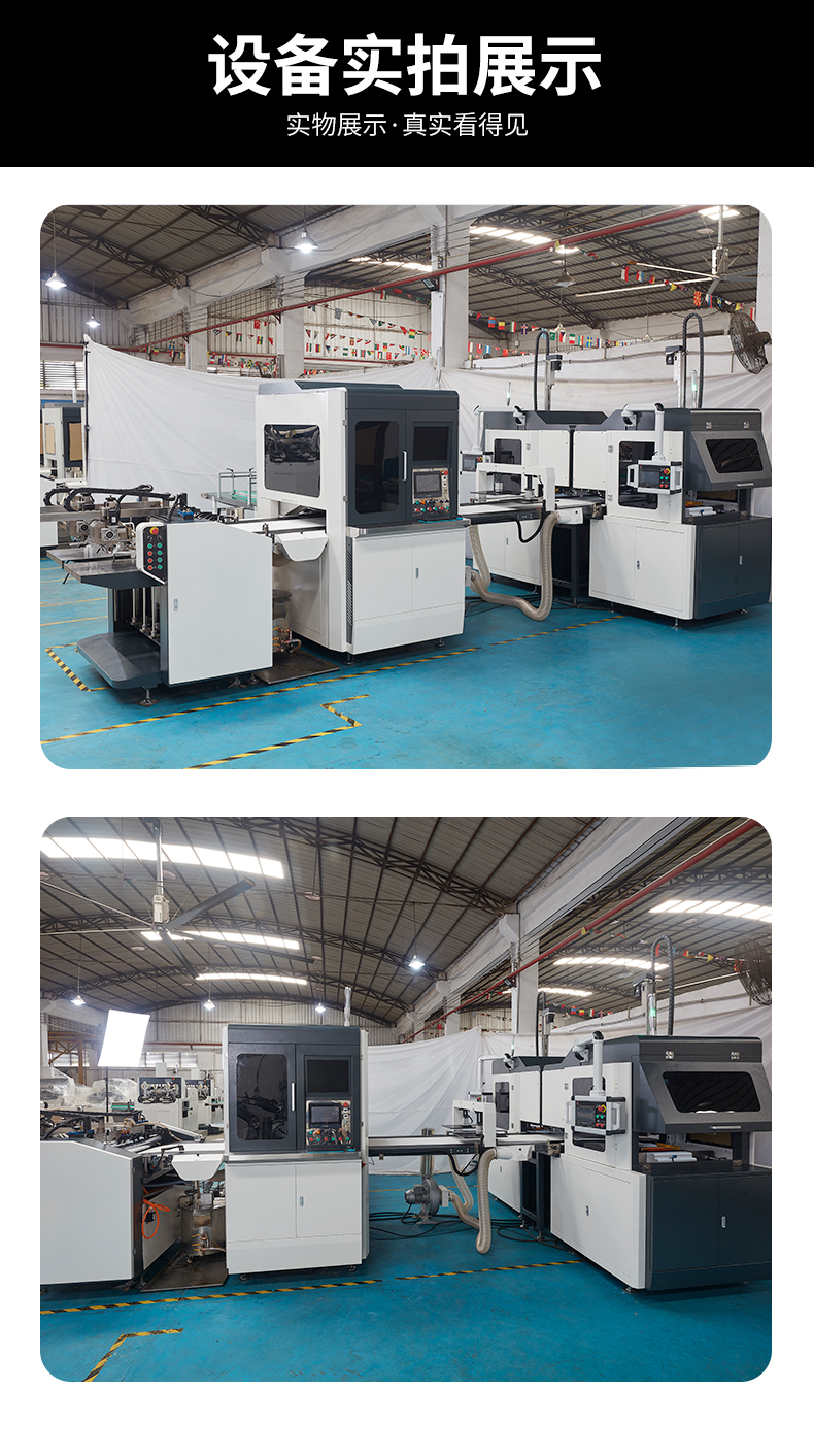 適合各種天地蓋的自動生產線,故障診斷功能,自動吸送面紙和送灰板功能,高精度凸輪飛達送紙,整機采用松下伺服控制系統,視覺定位系統及機器抓取,采用雅馬哈機器人,采用全新循環溫控上膠系統,采用高清攝像頭定位可精準定位天地盒、灰板、皮殼。