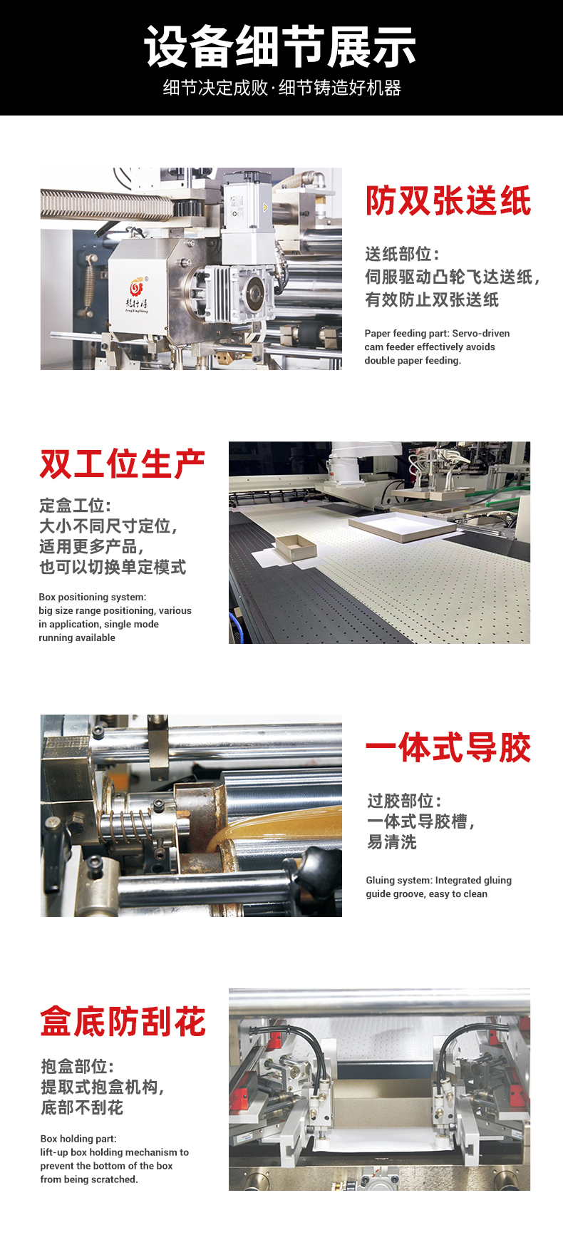 伺服驅動凸輪飛達送紙,有效防止雙張送紙◆大小不同尺寸定位,適用更多產品,也可以切換單定位模式◆一體式導膠槽,易清洗◆提取式抱盒機構,底部不刮花